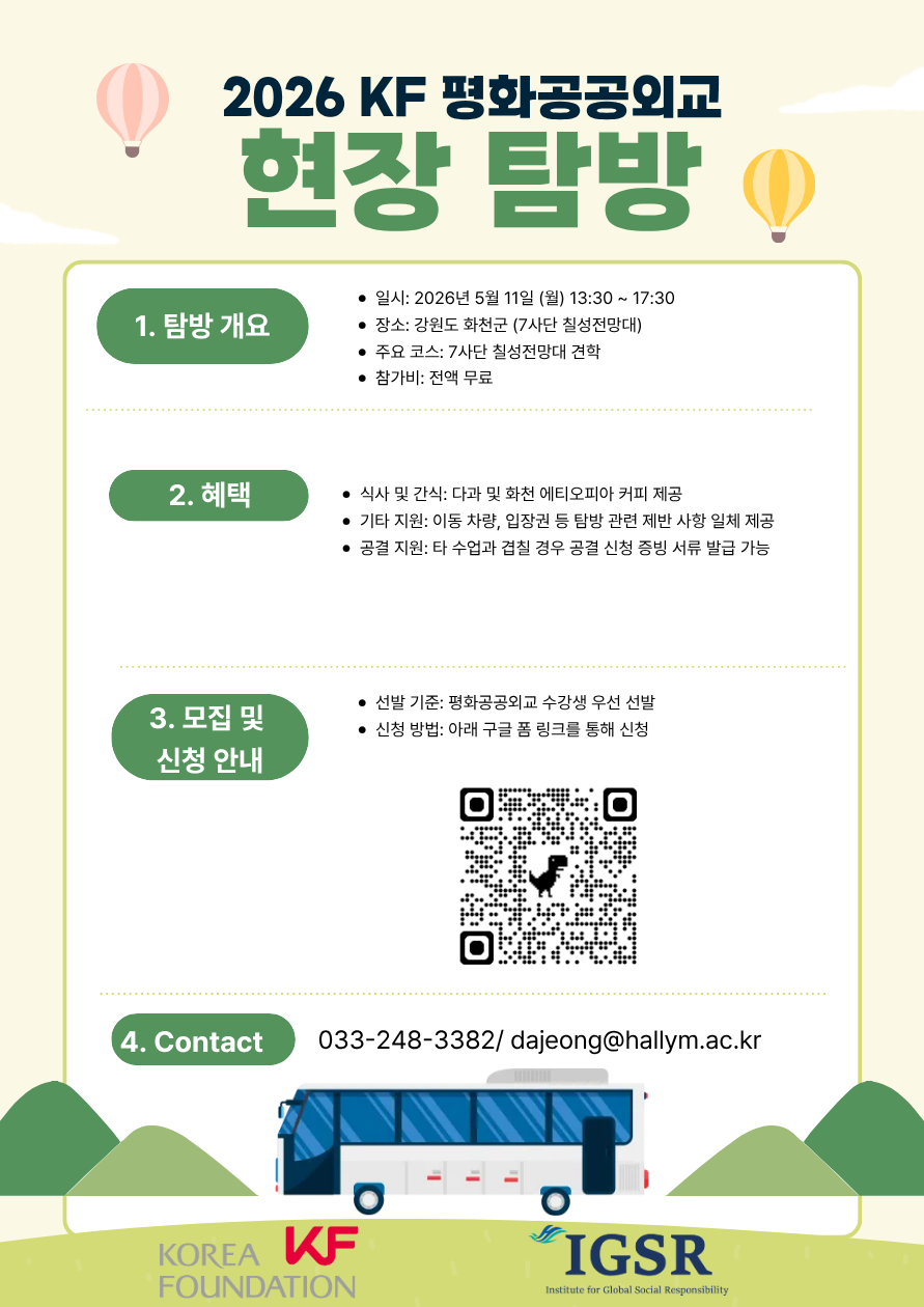 한림대학교 글로벌사회공헌연구소(IGSR)에서는 한국국제교류재단(KF)의 지원을 받아 2026 KF 공공외교 현장탐방을 개최합니다.